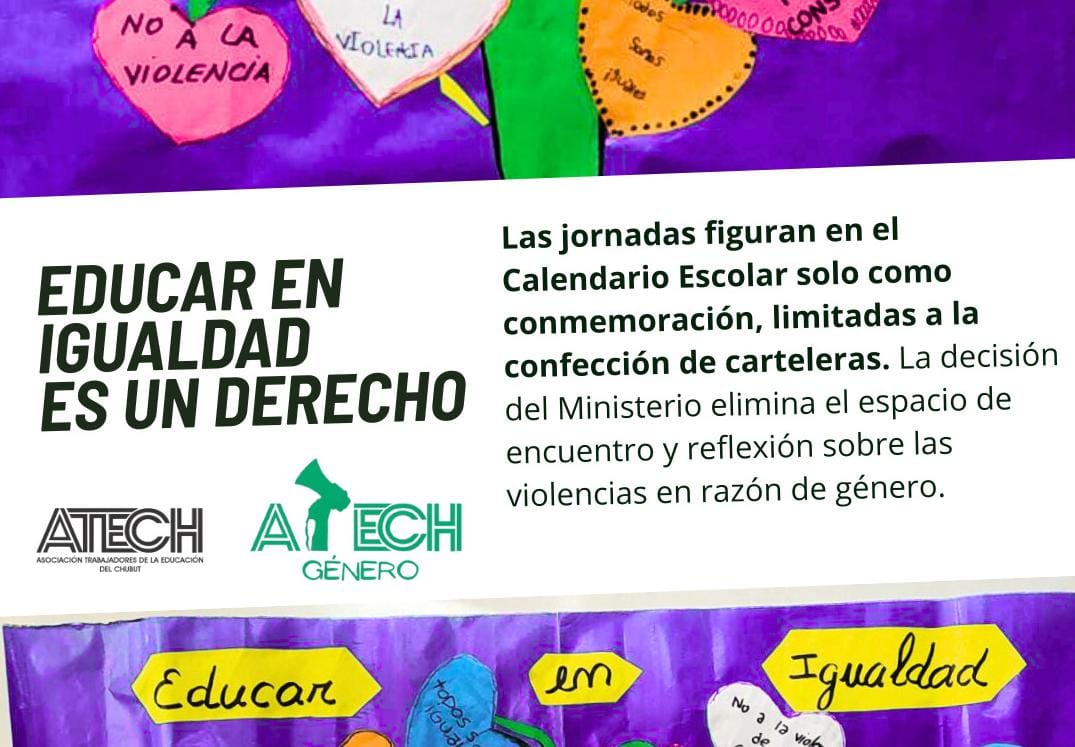 El día martes 21 de octubre la Secretaría de Género de la Regional Sur y de la Junta Ejecutiva Provincial de ATECH realizamos una presentación ante el Ministerio de Educación reclamando la reinstauración de las Jornadas Educar en Igualdad – Ley 27.234. Actualmente figuran en el en el Calendario Escolar como conmemoración Forma 4, lo que implica la confección de una cartelera, acompañada por una mención explicativa.